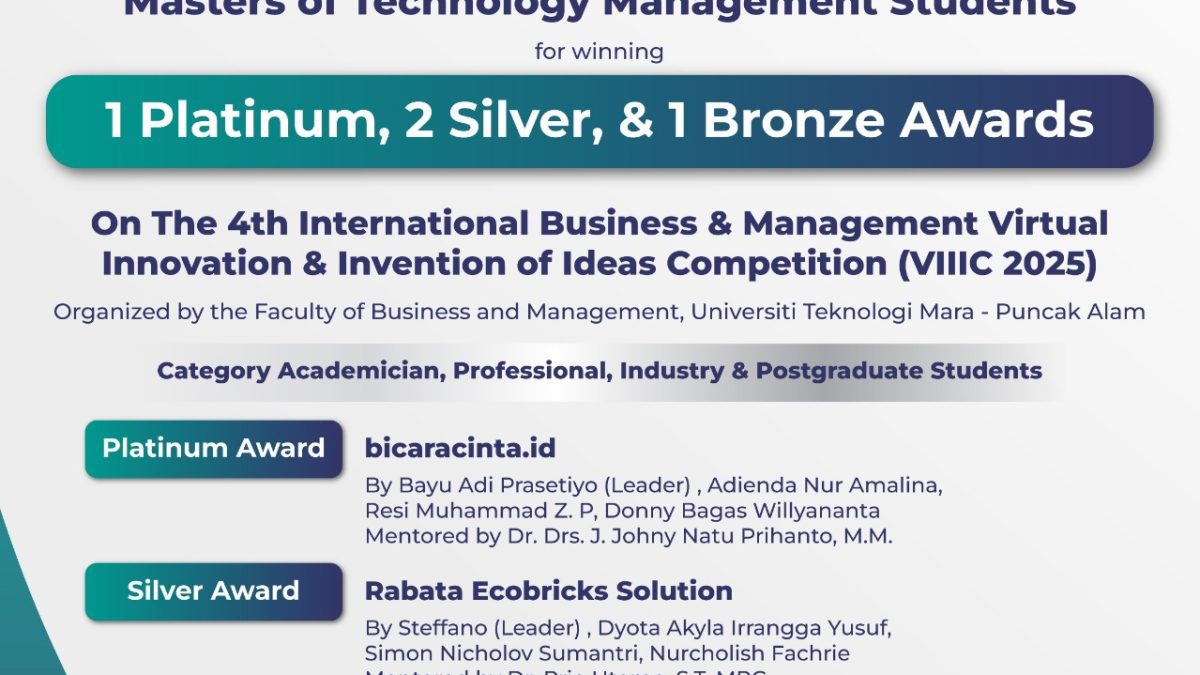 TANGERANG – Mahasiswa pascasarjana Program Magister Manajemen Teknologi (MMT) Universitas Multimedia Nusantara (UMN) kembali menorehkan prestasi membanggakan di kancah internasional. Empat tim mahasiswa MMT UMN Batch 12 masing-masing berhasil memenangkan penghargaan, mulai dari Platinum Award (Juara 1), Silver Award (Juara 2), hingga Bronze Award (Juara 3) di ajang kompetisi “The 4th International Business and Management Virtual Innovation & Invention of Ideas Competition (VIIIC) 2025”.