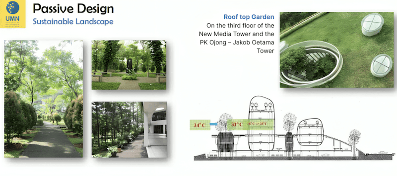 UMN’s passive design includes sustainable landscaping such as rooftop gardens on the third floor of the New Media Tower and the PK Ojong – Jakob Oetama Tower. These green spaces not only enhance aesthetic appeal but also improve the microclimate around the buildings. Strategically planted trees reduce the incoming air temperature from 34°C to 31°C before it enters the buildings, and combined with double facades, the indoor temperature can be lowered to approximately 28°C, reducing the need for artificial cooling. The rooftop gardens also serve as valuable green open spaces that contribute to energy savings.