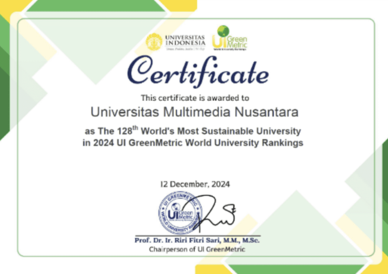 One of the key initiatives in this commitment is UMN’s active participation in the UI GreenMetric, a global ranking that evaluates universities on their sustainability performance. In the 2024 UI GreenMetric World University Rankings, UMN proudly secured the 128th position globally and emerged as the top private university in the Greater Jakarta Area. This accomplishment underscores UMN’s dedication to fostering a greener future and supporting sustainability at every level. For more details, visit UMN is ranked 128th in the world in the UI GreenMetric 2024.