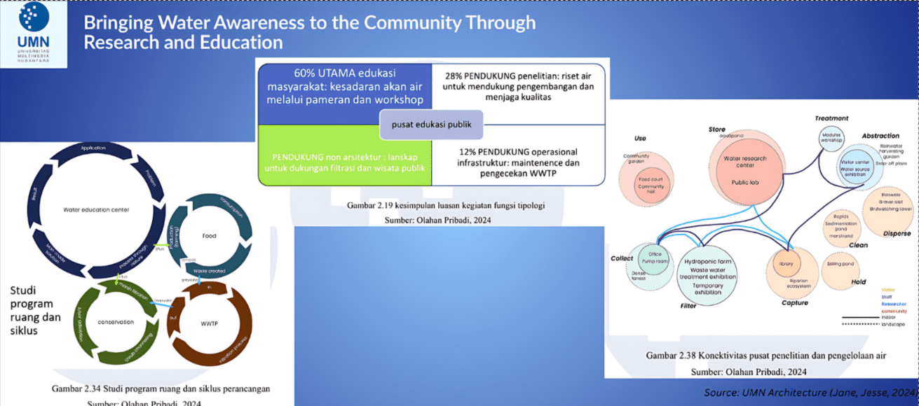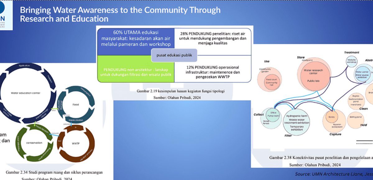 December 17, 2024Tangerang – In response to the urgent issue of water pollution in Jakarta’s Pluit Reservoir, students from Universitas Multimedia Nusantara (UMN) designed a regenerative Water Research and Education Center aimed at restoring not only the environment, but also public awareness around responsible water usage. Once a natural swamp and water catchment area, the reservoir has faced heavy ecological degradation due to unfiltered sewage discharge and unplanned urban development. The proposed center integrates ecosystem restoration, sustainable infrastructure, and community education into one functional space, encouraging the public to rethink their relationship with water in urban environments.