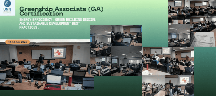 Continuing Education Department (CED) and the Teknik Fisika Study Program at UMN partnered with Green Building Council Indonesia (GBCI) to hold a two-day Greenship Associate (GA) training and certification on June 12-13, 2024, at UMN campus. This program not only serves Teknik Fisika students, who are required to complete it before graduation—but also welcomed participants from other departments like Architecture, as well as members of the local community. The training offered comprehensive education on energy efficiency, green building design, and sustainable development best practices. By engaging both students and the wider community, this initiative actively promotes awareness of clean energy and energy-saving methods, empowering participants to apply their knowledge in future projects, internships, and careers that support a greener, more sustainable environment.