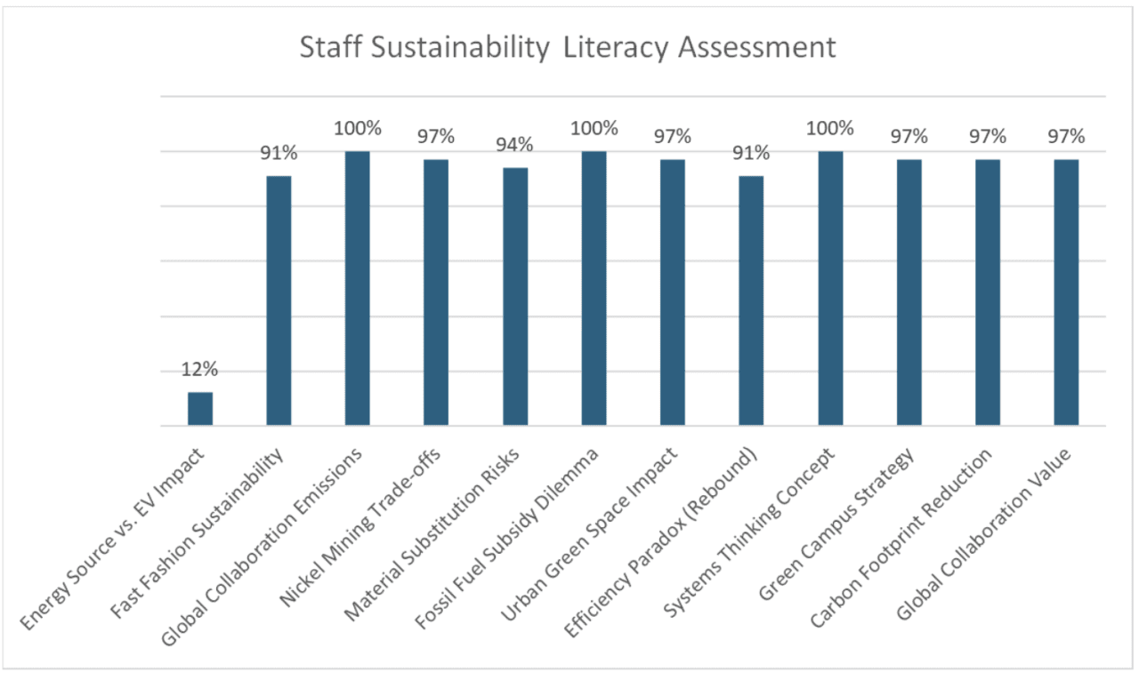 - Nickel Mining, Urban Green Space, Green Campus, Carbon Reduction, & Global Value (97%): Extremely high scores indicate that staff are well-versed in the practical and ecological trade-offs of modern green strategies.