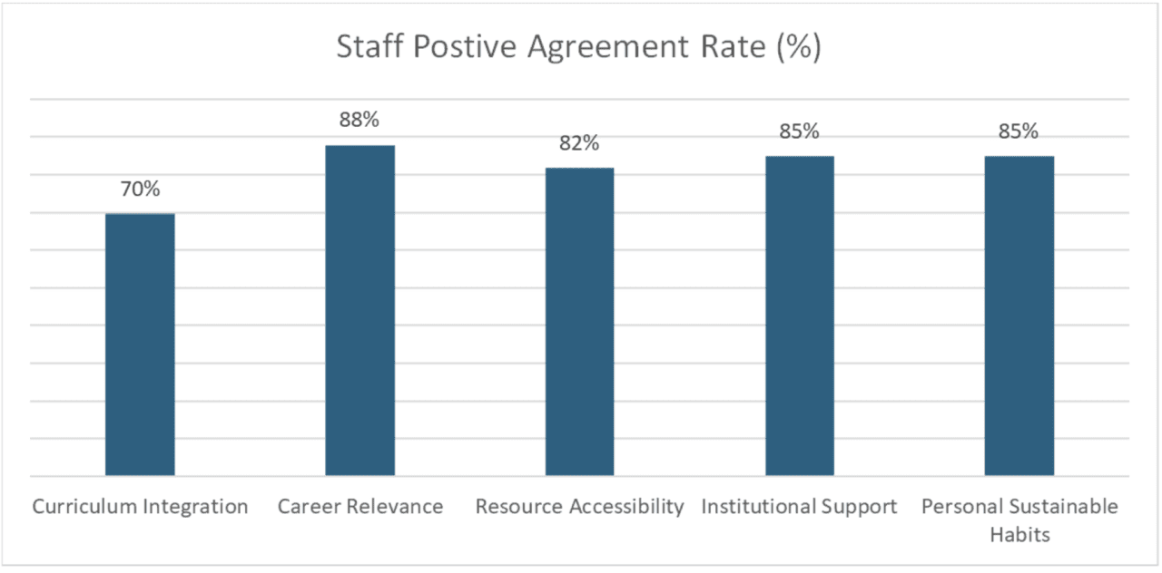 - Curriculum Integration (70%): While still high, this is the lowest perception score. It suggests that while staff are personally committed, they see room for improvement in how sustainability is formally integrated into academic and operational programs.