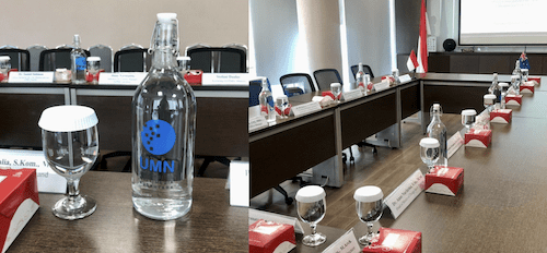 Guest reception standards at UMN include the use of reusable glass bottles, goblets, and eco-friendly snack packaging. (UMN Documentation)