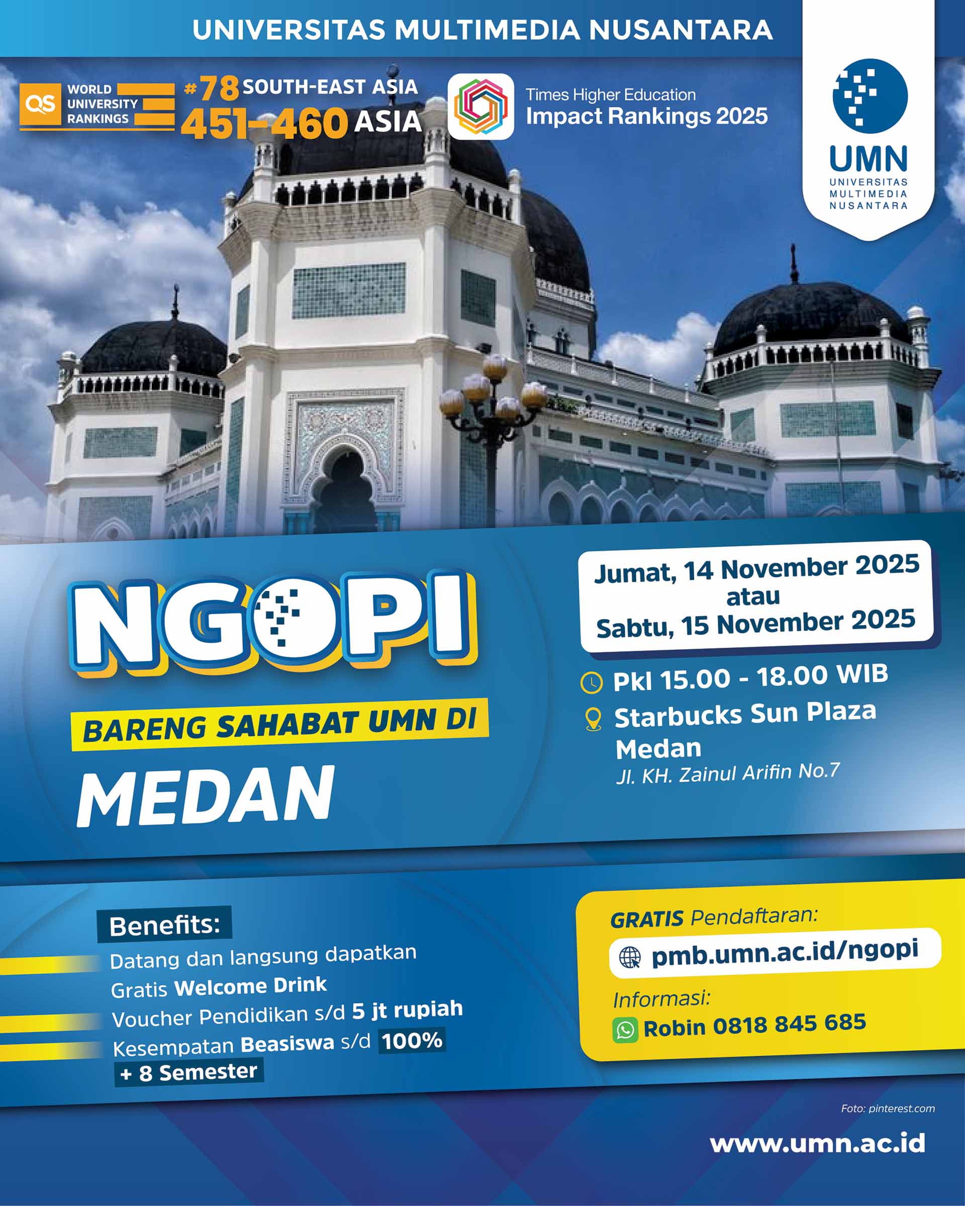 UMN akan mengadakan NGOPI buat kamu yang tinggal di Medan. Acara ini diadakan khusus buat kamu yang ingin berkuliah di UMN Tahun Akademik 2026/2027! Jadi, jangan sampai ketinggalan ya, karena melalui NGOPI kamu bisa KONSULTASI seputar UMN dan perkuliahannya.