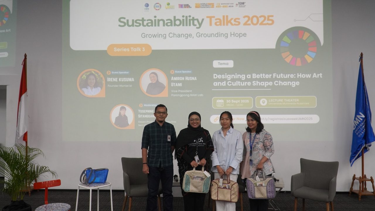 Tangerang – Pada Selasa (30/09/2025) kegiatan Sustainability Talk UMN berlanjut dan kali ini bersama dengan Fakultas Seni dan Desain UMN. Sustainability Talk ini akan membahas tentang bagaimana peran produksi serta desain yang berkelanjutan bersama Amiroh Husna Utami selaku Vice President Parongpong RAW Lab dan Patricia Irene Kusuma selaku Founder Mortier, dimoderatori oleh Yosephine Sitanggang, M.Ars., selaku Dosen Prodi Arsitektur. Sustainability Talk kali ini mengangkat topik “Designing a Better Future: How Art and Culture Shape Change”.